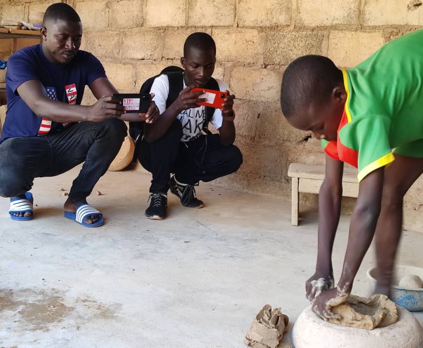 Idrissa SAWADOGO (en main le téléphone rouge) é reportage sur le site de la poterie de Guiloungou.
