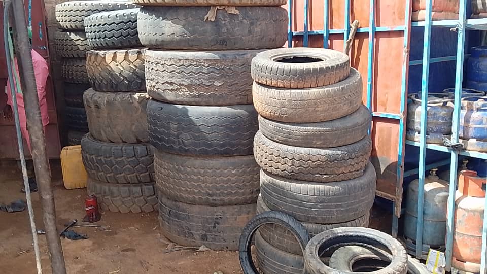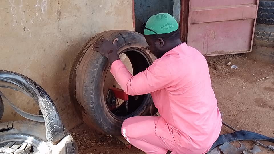 3 mai 2025, 9h15. La température à Kaya, est encore clémente. Dans un atelier de vulcanisation, un homme vêtu d’un complet rose coiffé d’un kufi vert, est noyé entre les pneus de véhicule parqués.