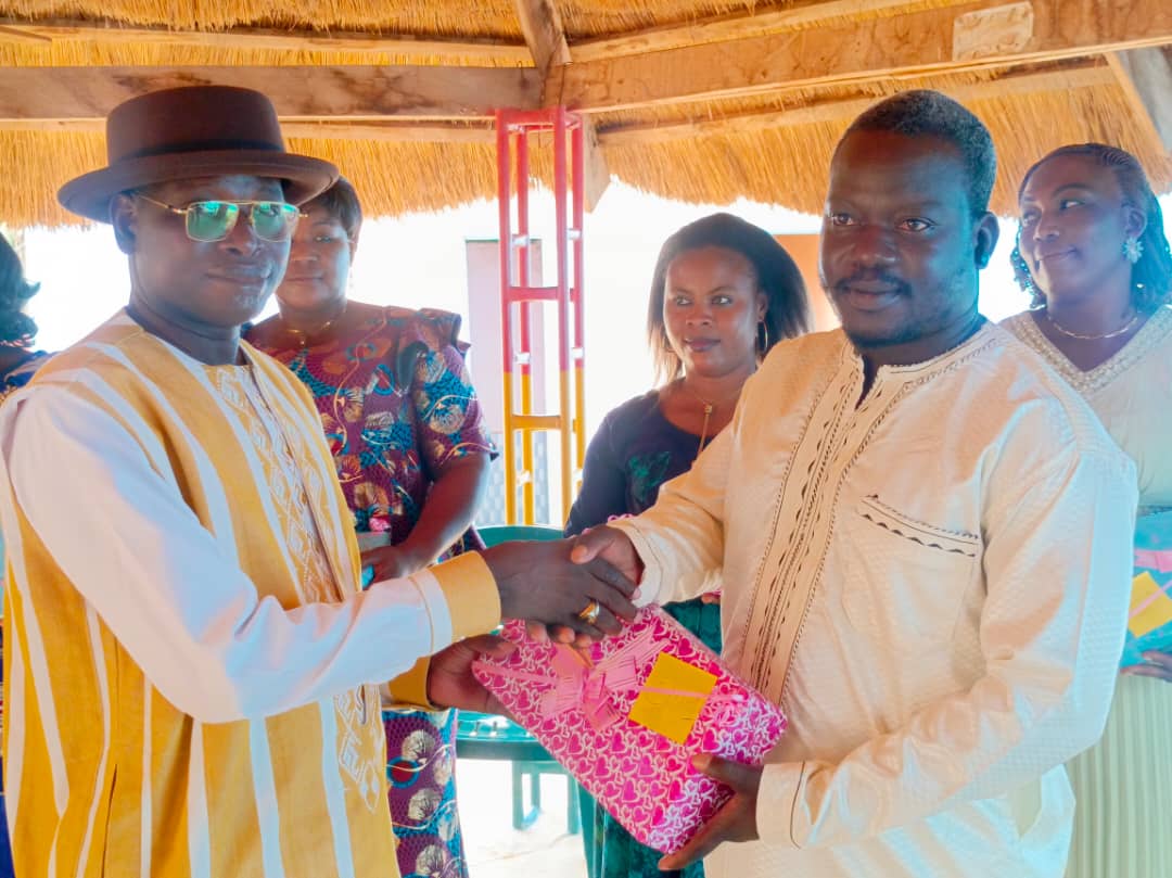 Le fondateur Emmanuel Tapsoba (à gauche) remettant un cadeau au directeur de l’école Amidou Zemdé, lors de la cérémonie de clôture des activités pédagogiques.