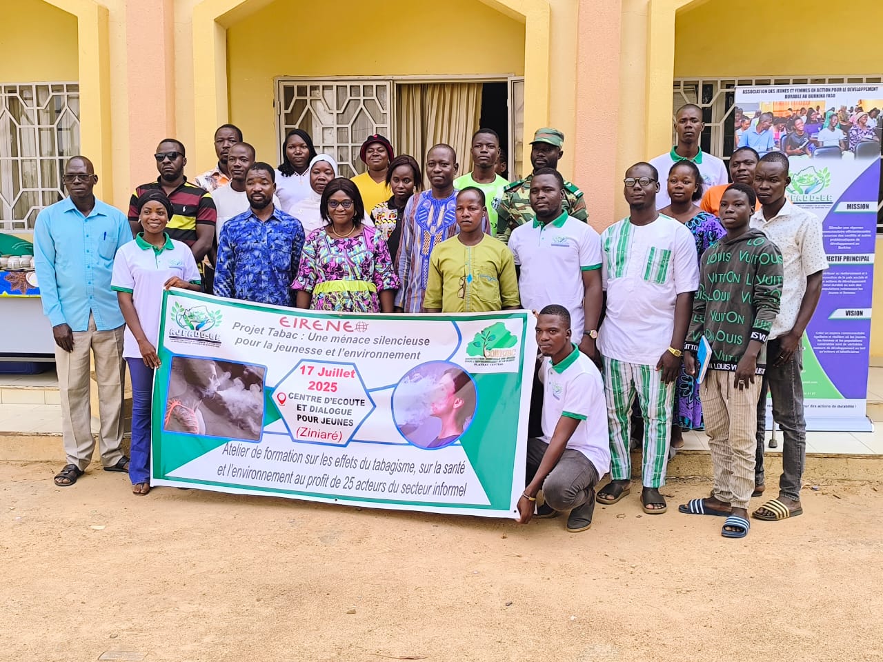 Dans le cadre du projet « Tabac : une menace silencieuse pour la jeunesse et l’environnement », l’Association des Jeunes et Femmes en Action pour le Développement Durable au Burkina Faso (AJFADD BF) a organisé un atelier de formation à l’intention de 25 acteurs du secteur informel. Financée par le Fonds de Soutien au Climat (FSC) de EIRENE, l’activité s’est tenue au Centre de dialogue et d’écoute pour jeunes de Ziniaré, sous la présidence du Président de la Délégation Spéciale (PDS) de la commune, en présence du Directeur provincial de la jeunesse de l’Oubritenga.